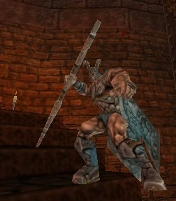 Gharroth reacts to Hiro's logic, as he calmly tries to explain their situation, that they are innocent and that they were attacked. Gharroth however, cannot be disuaded; he sees they reforged the holy sword, and the broken staff of Nharre proving they defeated him. He decides to avenge his loyal wizard, goes berserk, and fights Hiro.