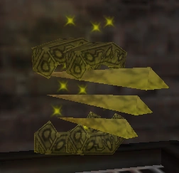 The Power Up is a rotating yellow object that emits small yellow sparkle particles. It gives off a yellow glow. The top and middle parts of the Power Up rotate quickly in different directions.