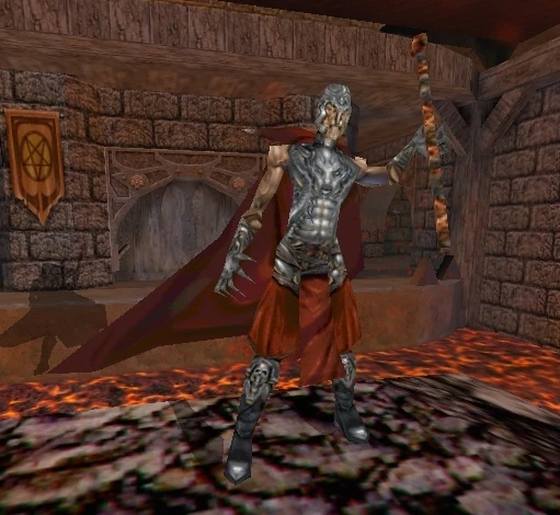He appears when you turn two dials in E3M3C, and step onto a platform in the middle of a pool of lava. He will then proceed to attack the player with his staff, by firing meteorites and fireballs at the player using his staff. When defeated, a giant staircase will arise from the platform, allowing the player to continue, along with a pedestal rising, holding the Stave of Stavros.